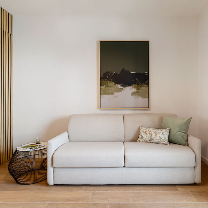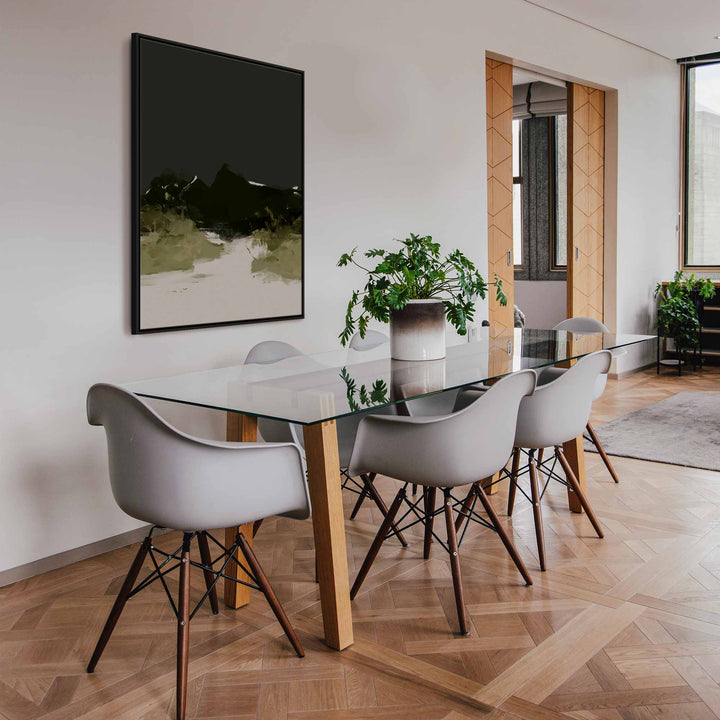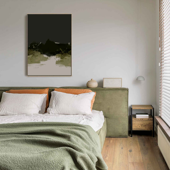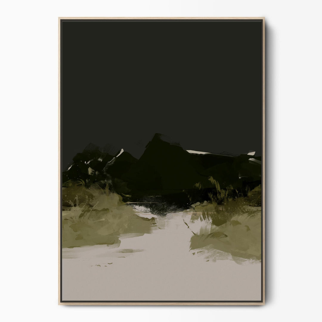 Lose yourself in nature with our 'Natural High' large abstract canvas art — a modern abstract landscape that will take your breath away. With its dark, earthy greens, warm neutrals and loosely painted mountains and snow, this minimal wall art adds sophistication, style and all the cosy vibes to your space. As seen in Grand Designs Australia.