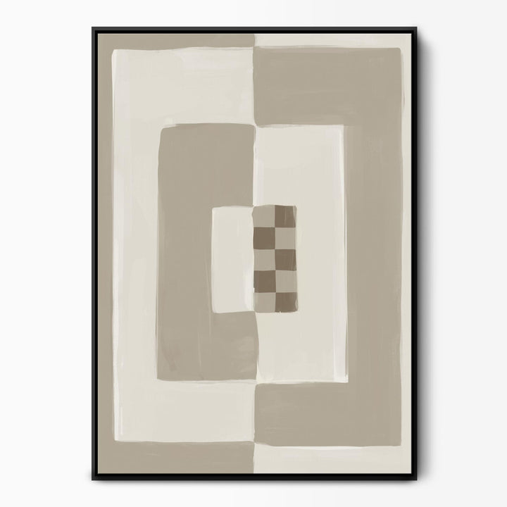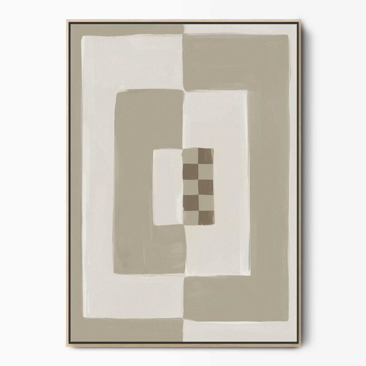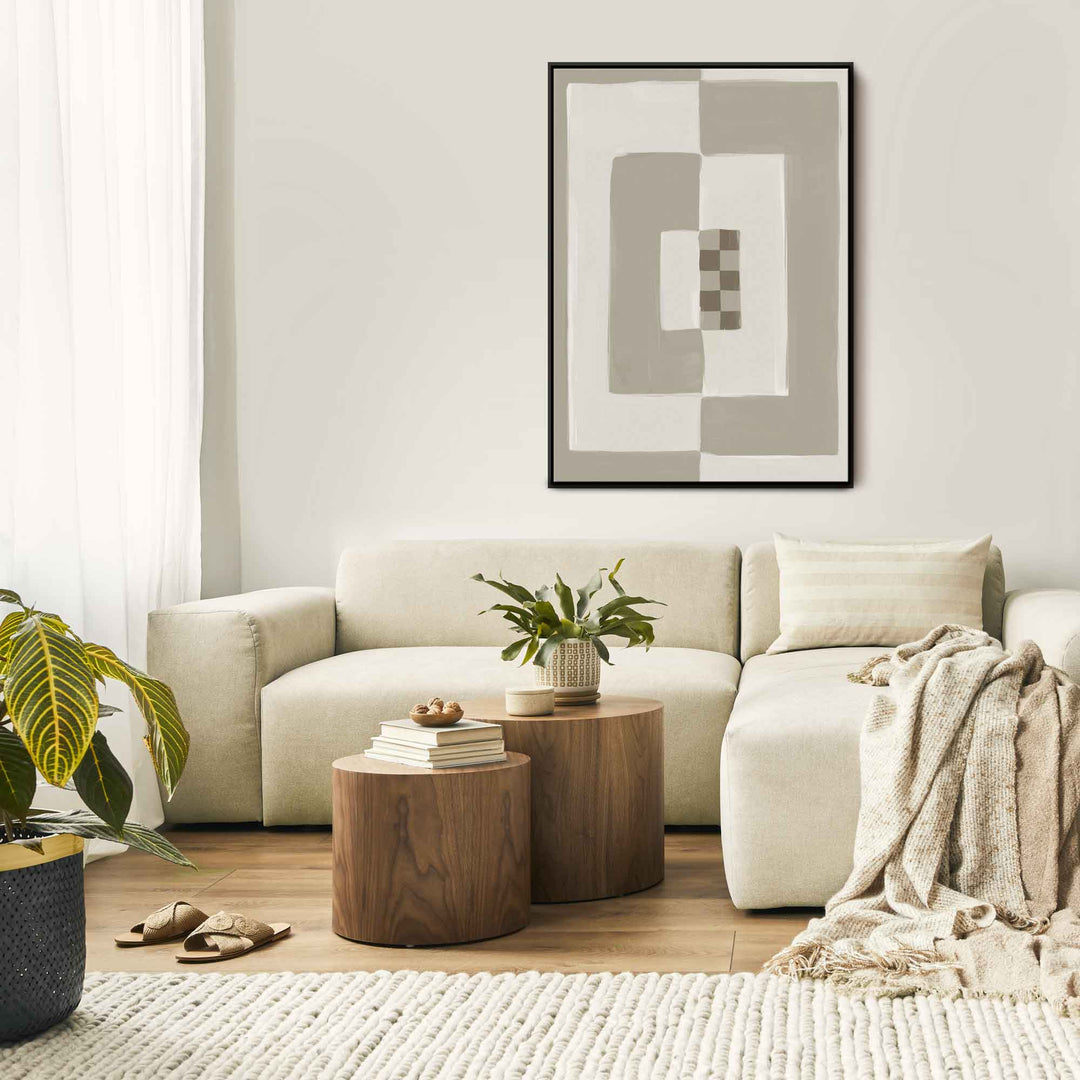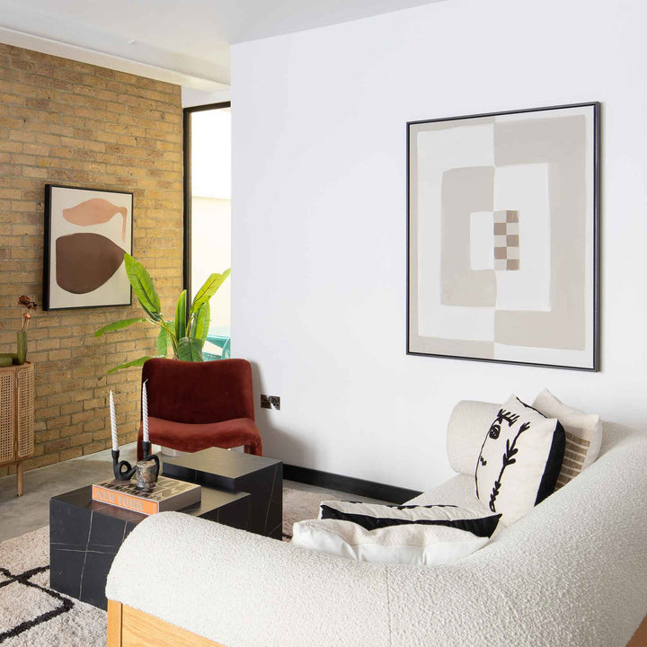 Elevate your space with our Opposites Attract abstract neutral canvas wall art featuring cream & beige tones in a bold painted block pattern with a small brown chequered detail. Perfect for bringing a cosy vibe to a mid-century or boho-style interior. As seen in Country Homes & Interiors Magazine.