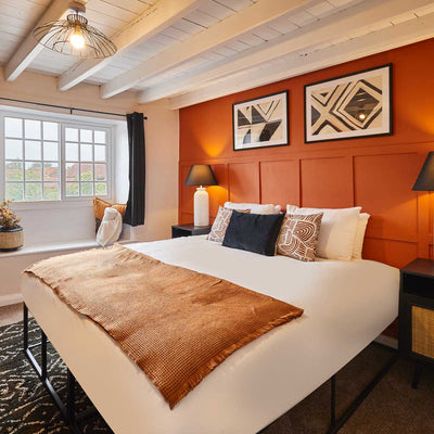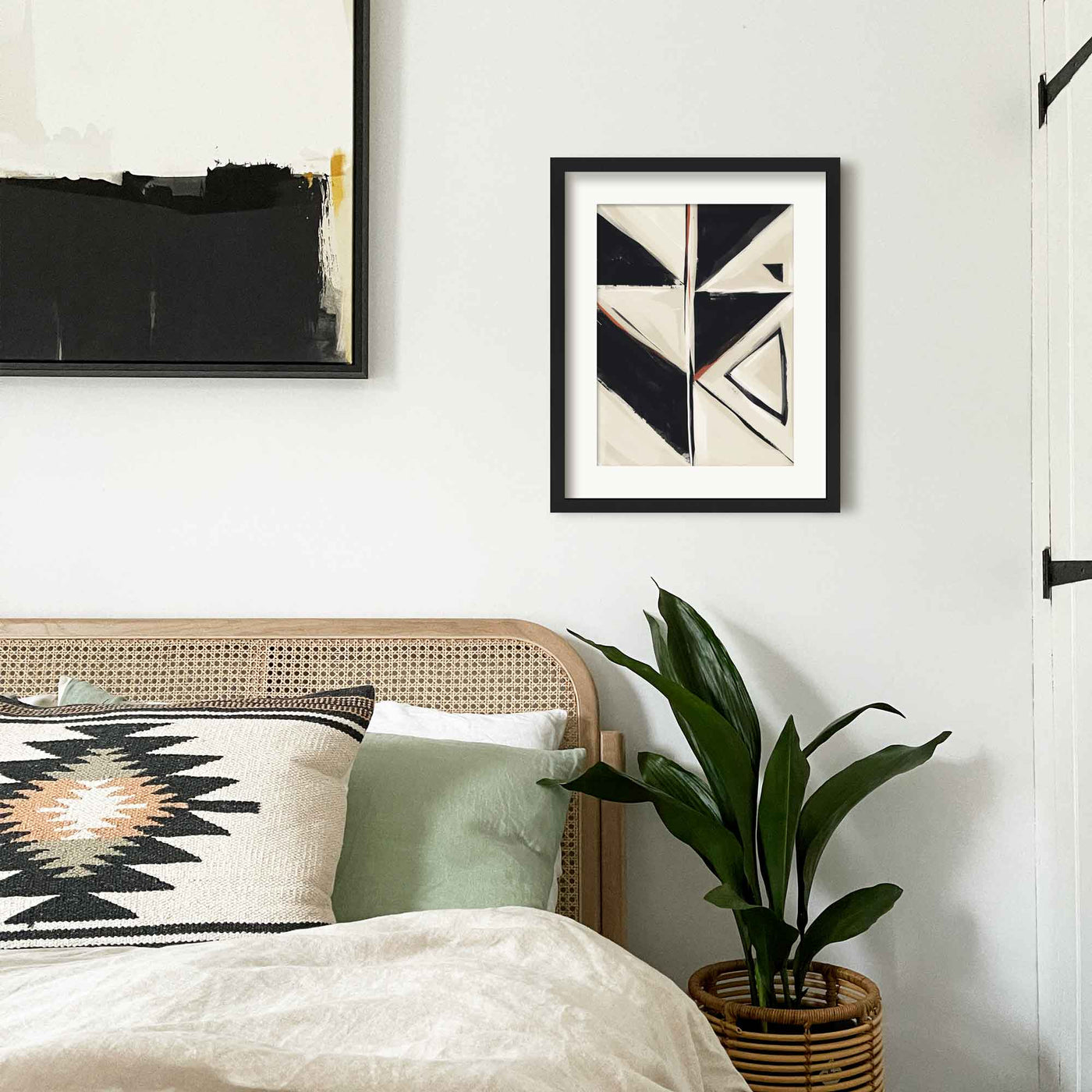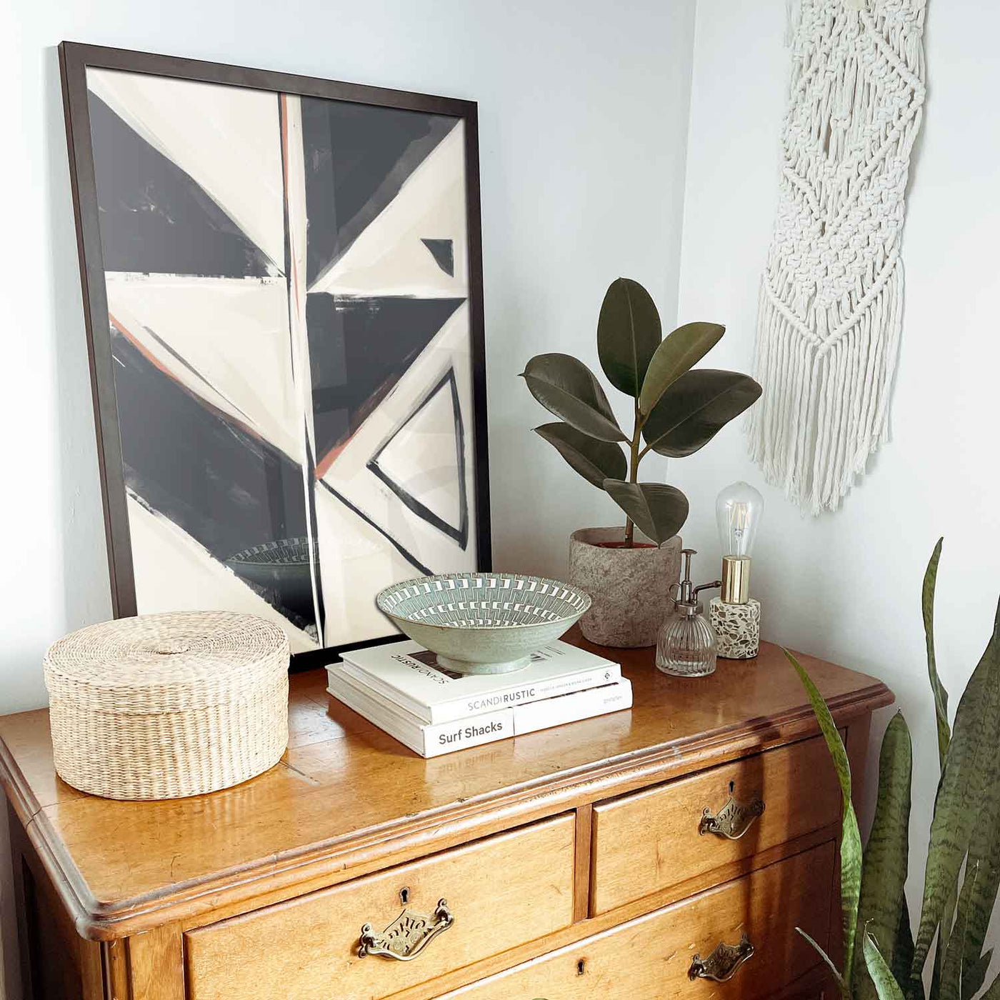 Our Aztec Shapes abstract canvas has that elevated boho feel. Inspired by Moroccan design, bold charcoal shapes meet soft neutrals and terracotta. Working beautifully with layered textiles and natural materials, the smaller size makes it easy to add character to cosy bedrooms, reading nooks or hallways that need a bit of warmth.