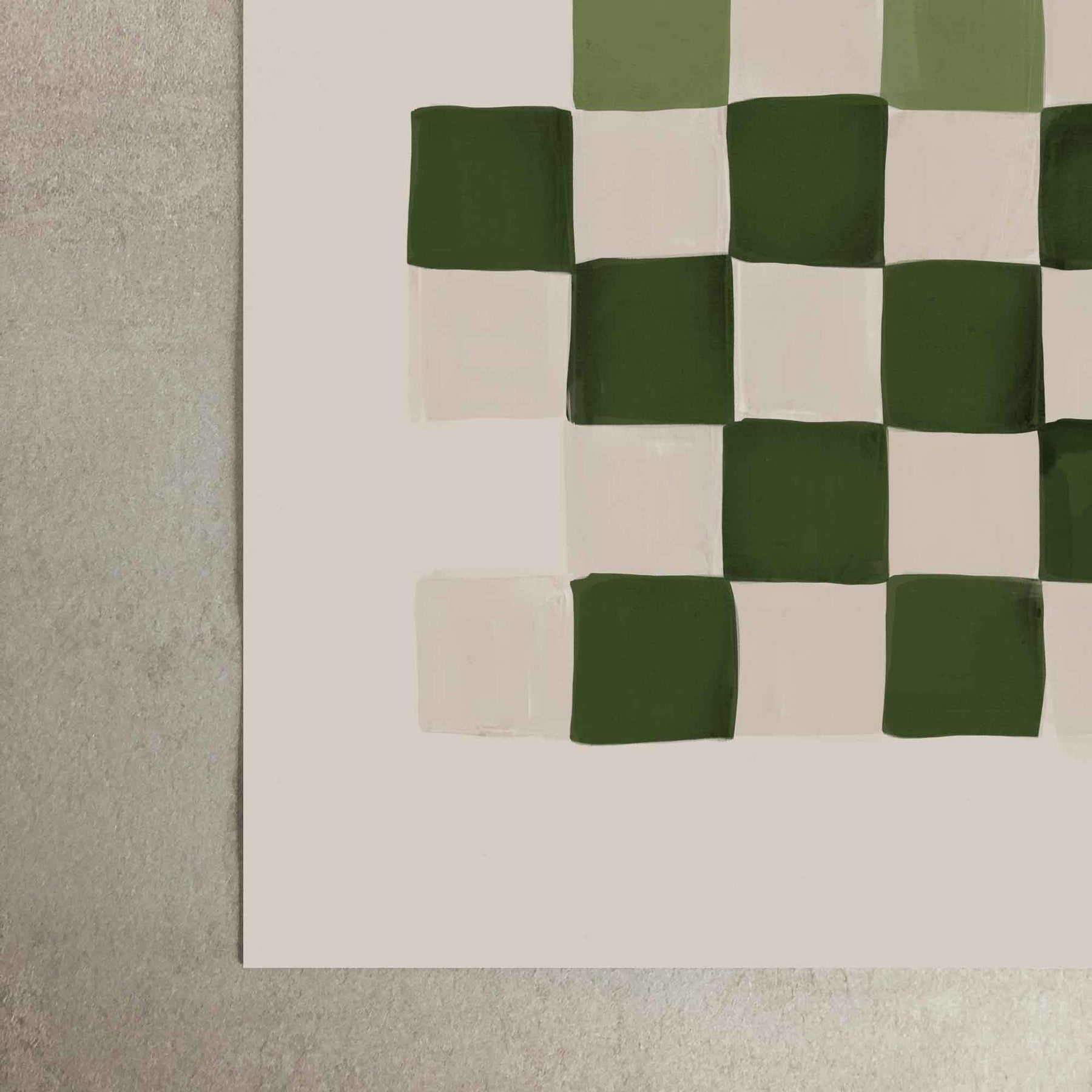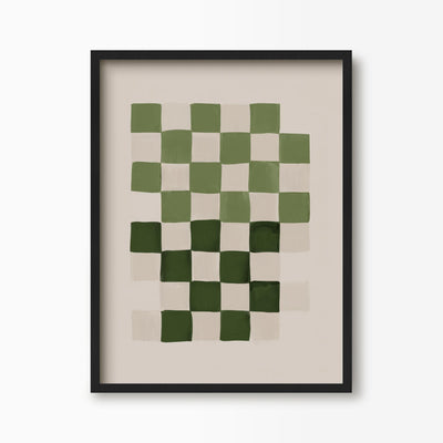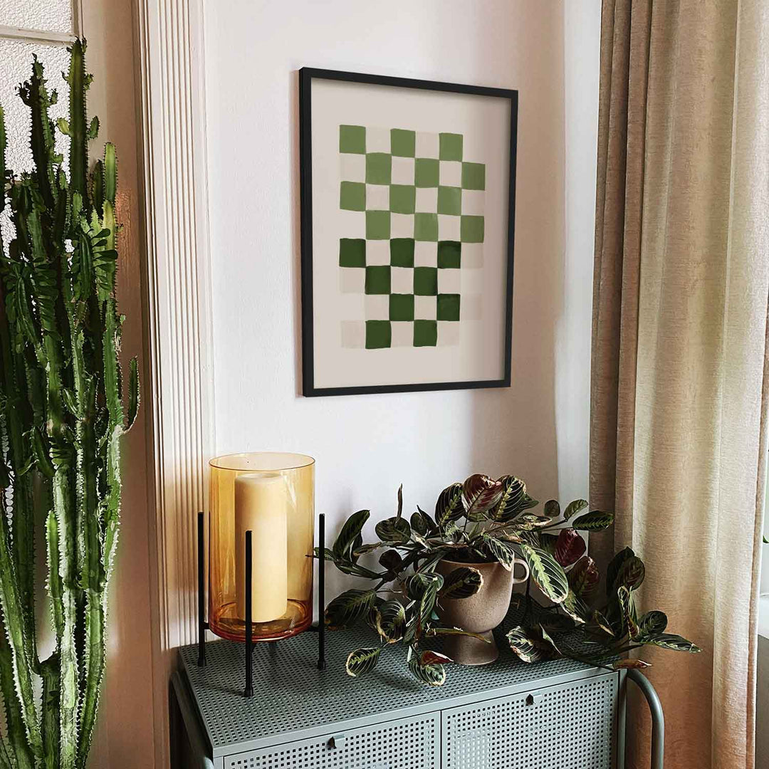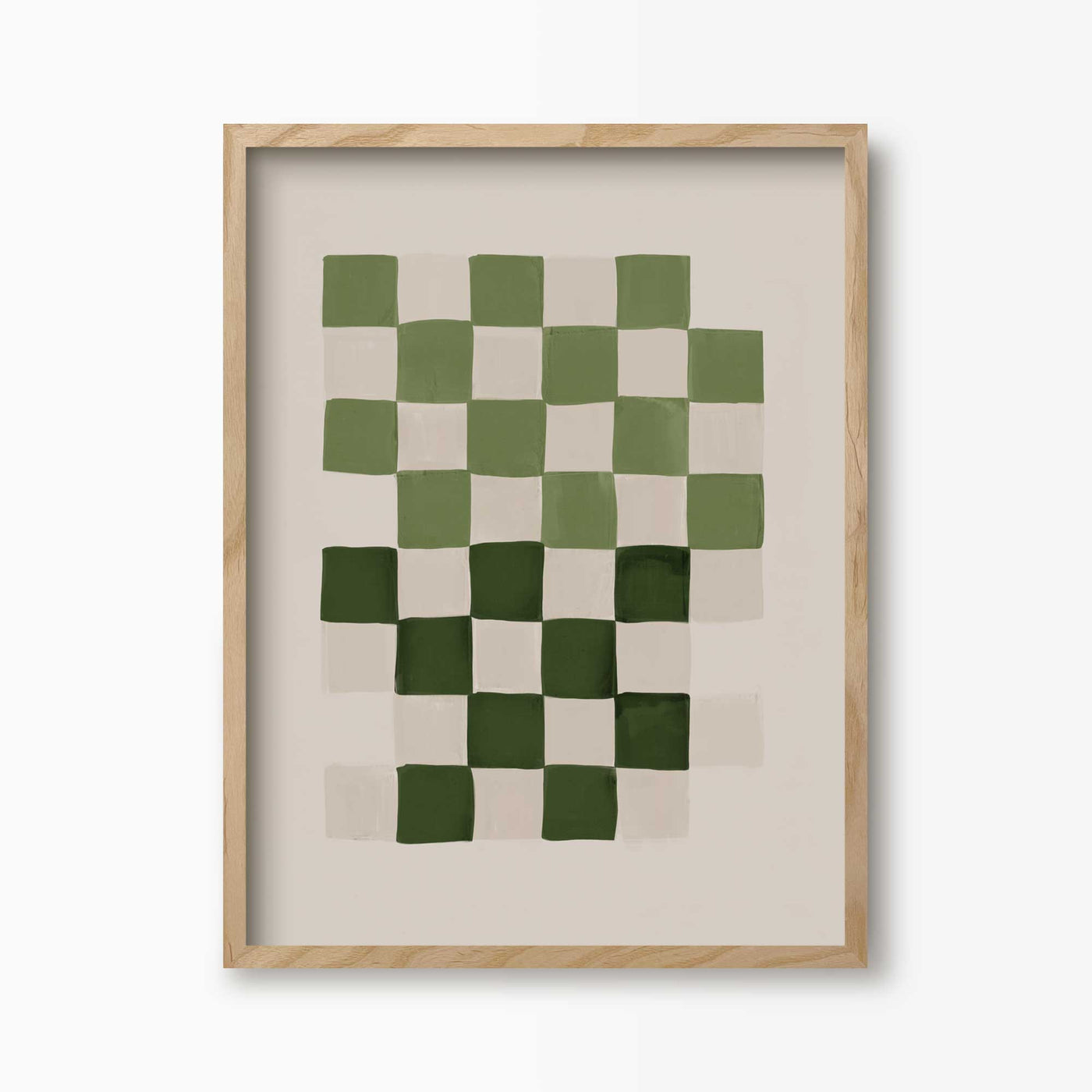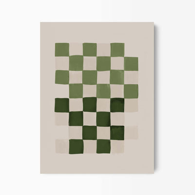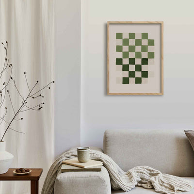 Our Chequered Earth canvas art brings a bold playful check pattern in a nature-inspired forest and earthy green colour palette against a stylish neutral background. Perfect for a modern bedroom, living room or home office. As featured in House Beautiful, House & Home, Red and The Lifestyle Magazine.