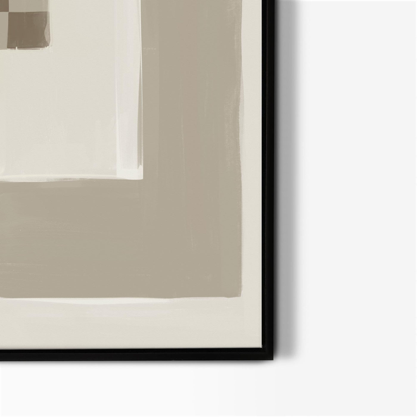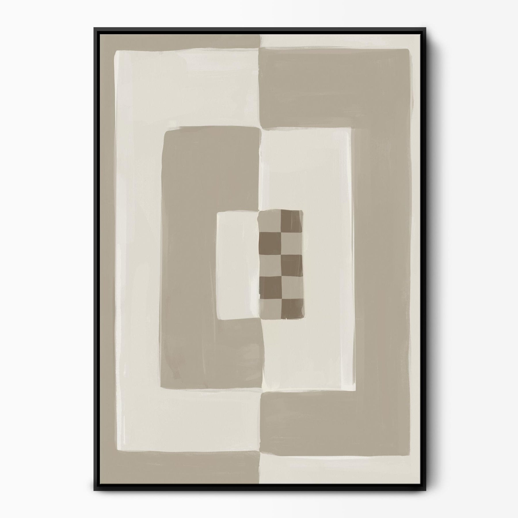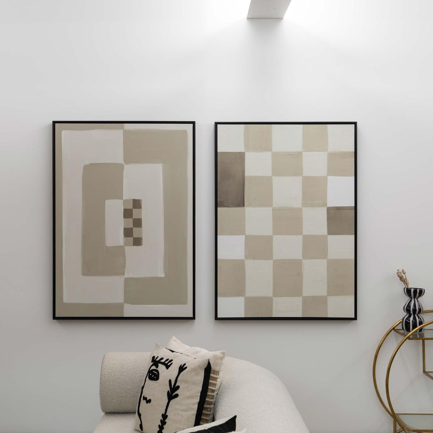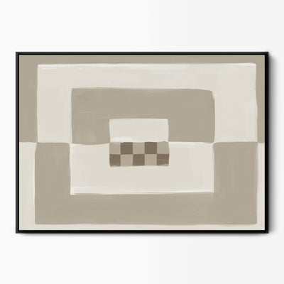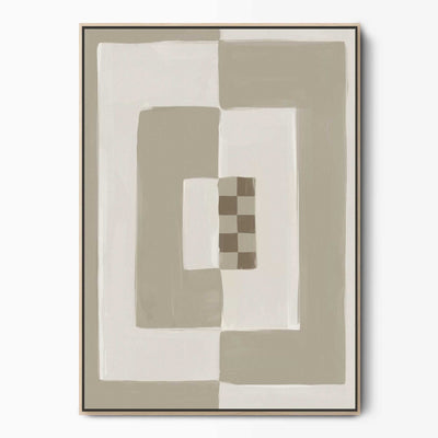 Elevate your space with our Opposites Attract abstract neutral canvas wall art featuring cream & beige tones in a bold painted block pattern with a small brown chequered detail. Perfect for bringing a cosy vibe to a mid-century or boho-style interior. As seen in Country Homes & Interiors Magazine.