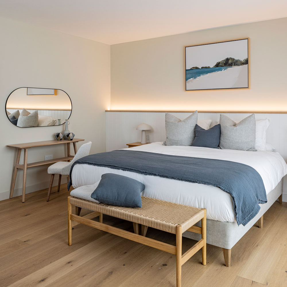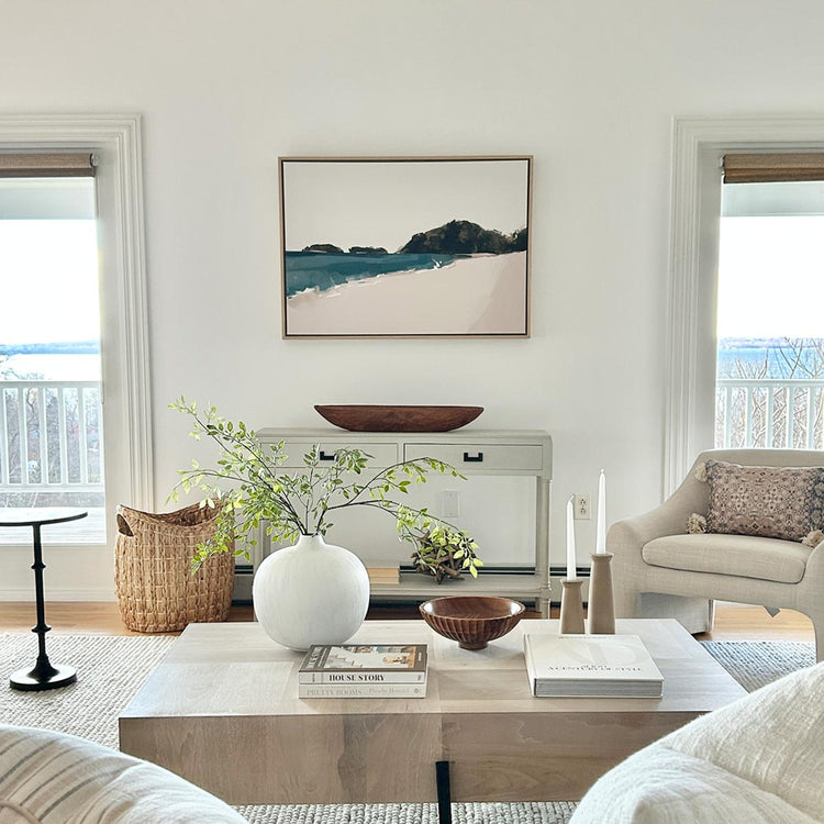 Escape to paradise every day with our Golden Bay beach canvas art. This oversized landscape art captures a beautiful day at the beach with white sands, blue sea and lush greenery. Designed in a toned-down palette — It's perfect for laid-back living.