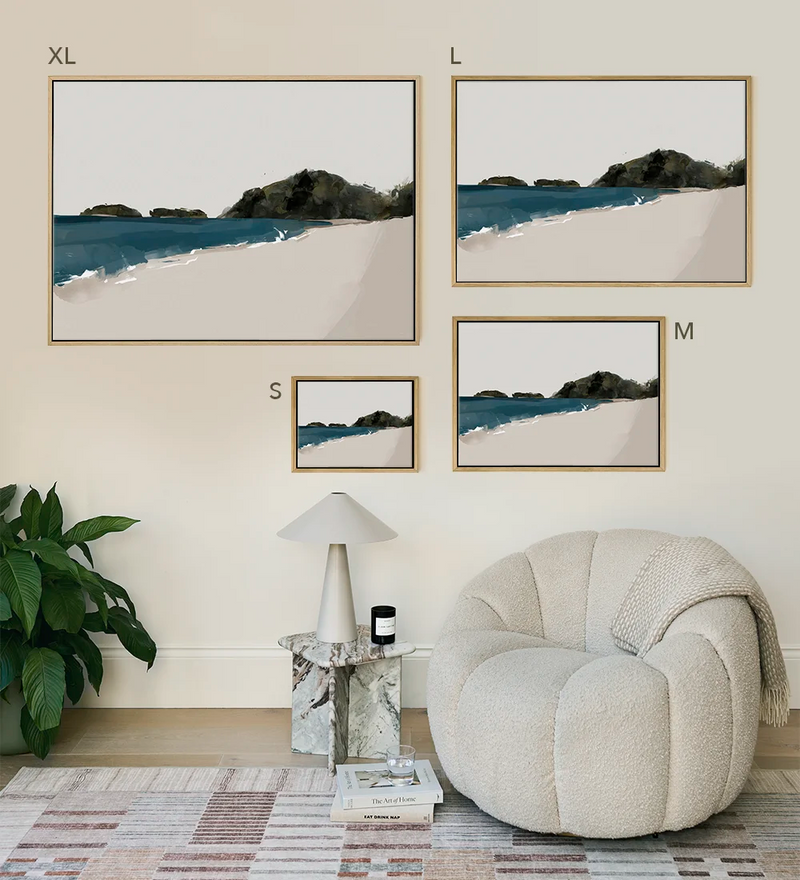 If you’re still deciding on the sizes, using masking tape can be a great way to visualise how it might look in your space. Mark out the Framed Size of each option, leave it up for a day or two, and even take a couple of photos on your phone. Keep checking back. You’ll soon get a feel for which one’s right.