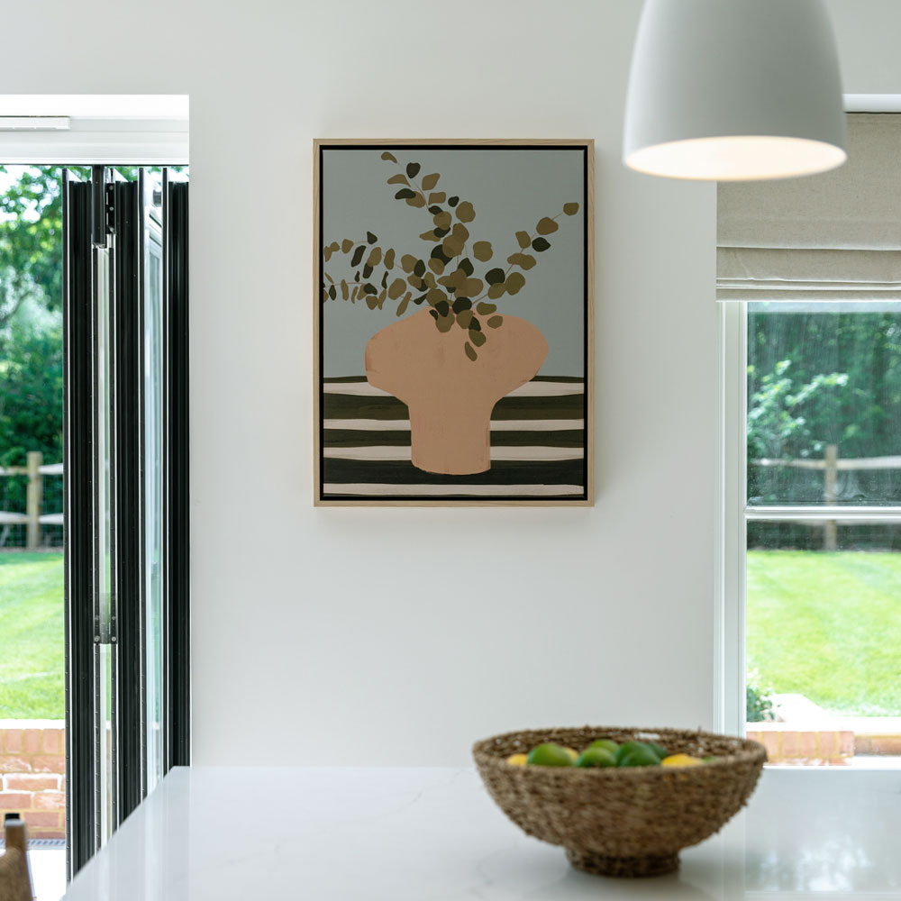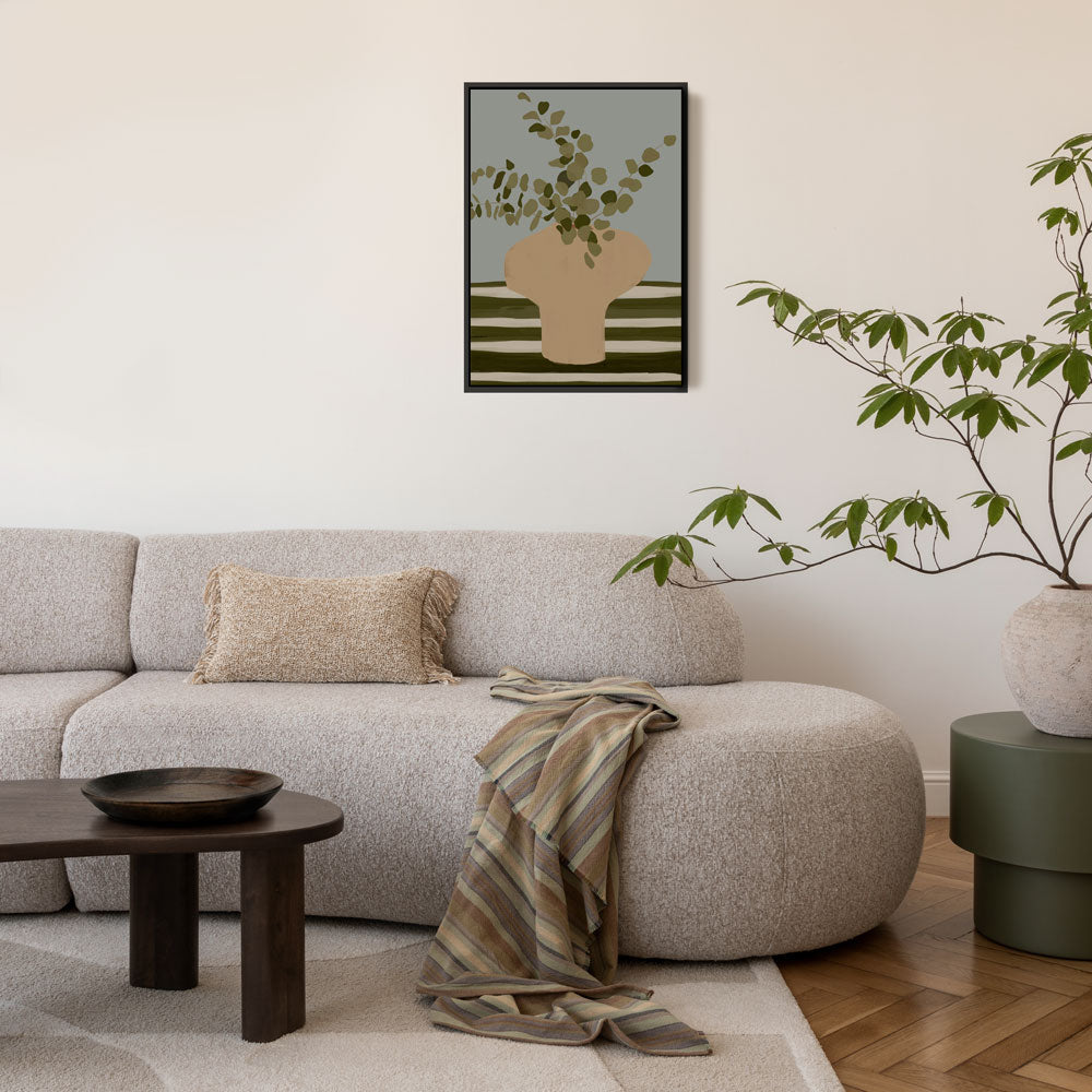 Bring a touch of playful energy to your kitchen, dining room, or gallery wall with our potted eucalyptus canvas art. This modern botanical wall art is loosely painted with warm earthy tones of dusky blue and olive green.